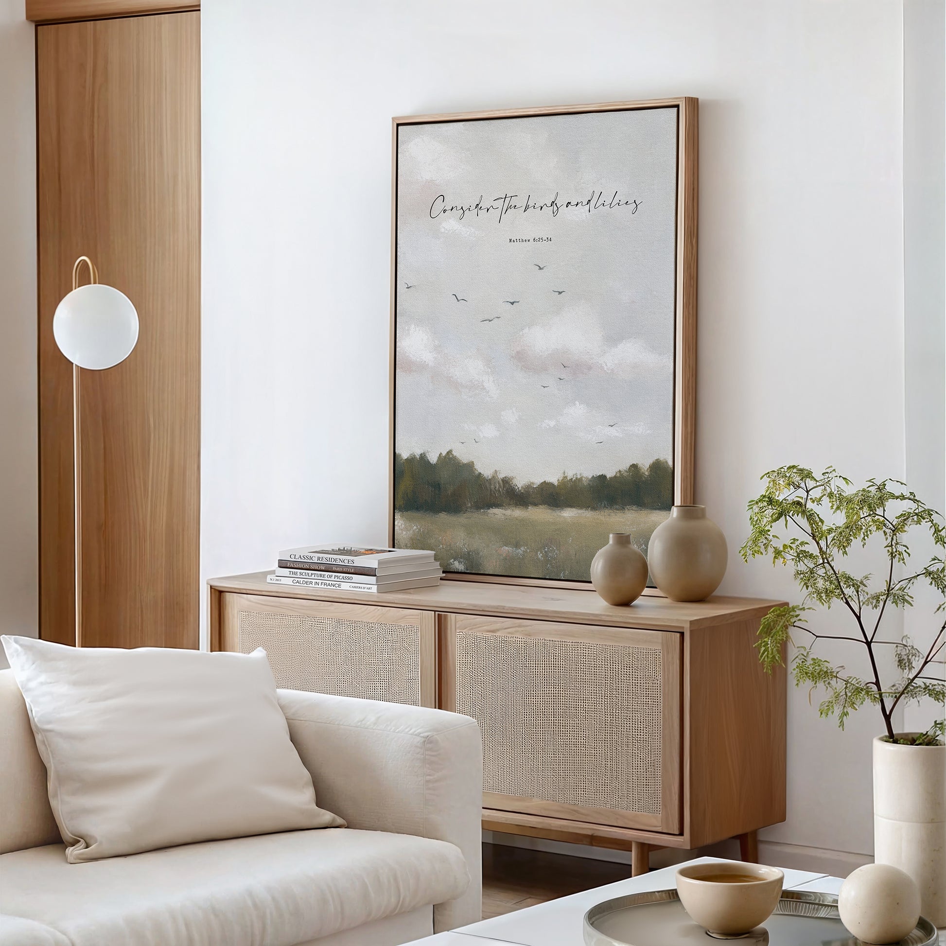Matthew 6 wall art — “Field & Feather” modern vintage Christian print of birds and florals, a Scripture-inspired piece for home décor and gifts.
